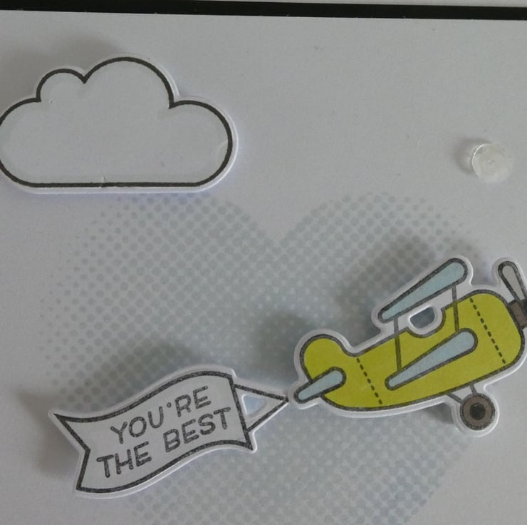 This tent fold Father's Day card has a green and blue biplane trailing a banner with the message 'you're the best' between 2 clouds, all slightly raised from the pale blue heart stamped background.