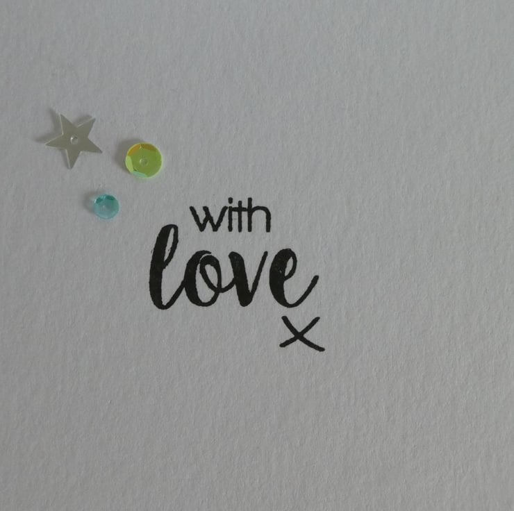 The card measures approximately 17.5 cm by 12.5 cm and is hand stamped inside with the message 'with love x' and finished with 3 sequins.