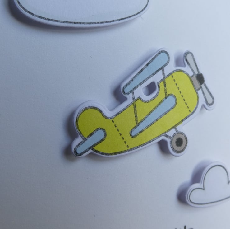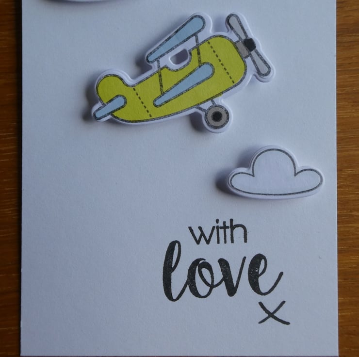 The matching gift tag is rectangular with a scalloped top edge and measures 8 x 12.5cm excluding ribbon. It has hand stamped and coloured images of a matching plane and clouds with the message 'With Love x' which matches the greeting inside the card,stamped in black archival ink in the bottom corner. It has been finished with a white organza ribbon patterned with polka dots,