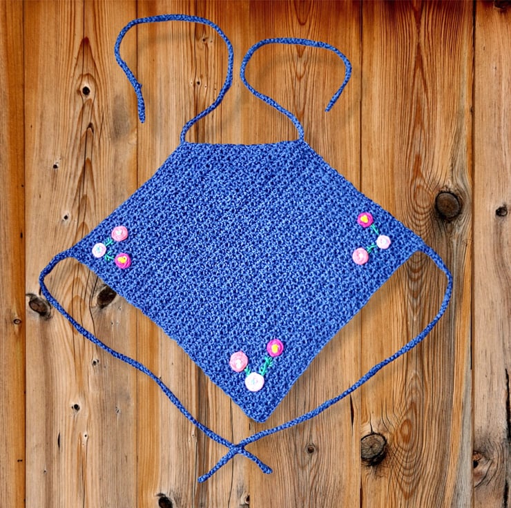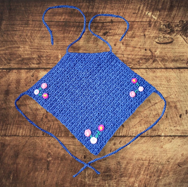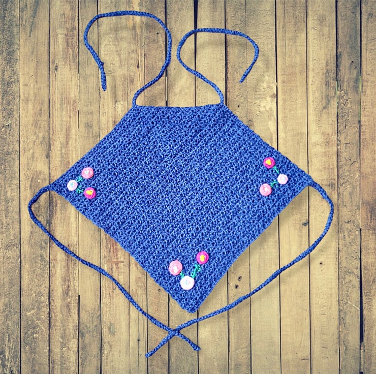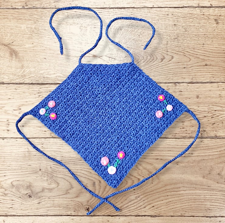 Halter top with flowers and main body colour is navy. U.K. size is small (S).