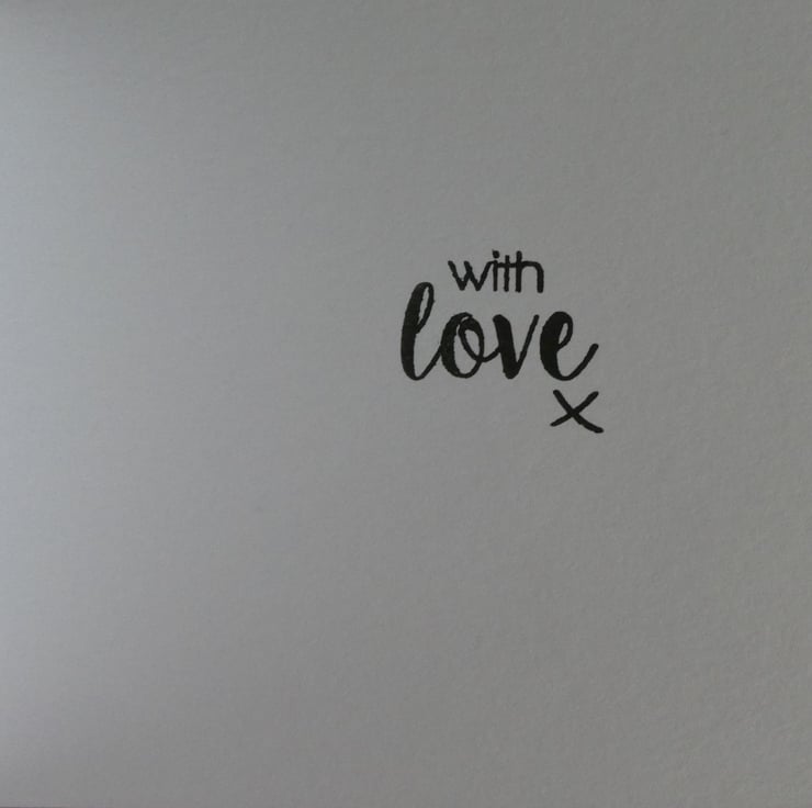 The card measures approximately 17.5 cm by 12.5 cm and is hand stamped inside with the message 'with love x' and finished with 3 sequins.