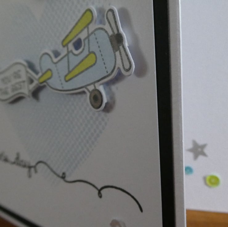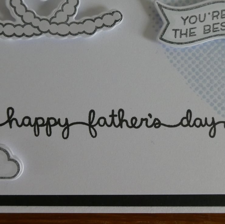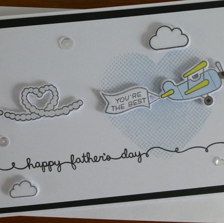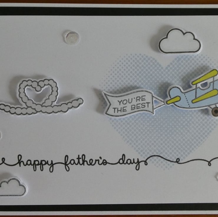 This landscape style Father's Day card has a blue and green biplane trailing a banner with the message 'you're the best' between 2 clouds and leaving a smoke trail with a heart design. The design is slightly raised from the pale blue heart stamped background.