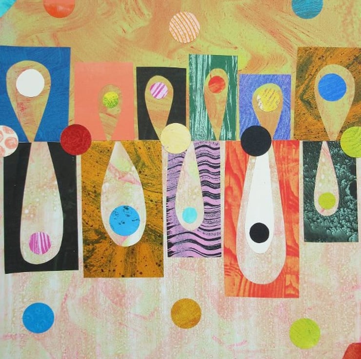 This set of original collage artworks is inspired by the design style of the Eames' Lucienne Day, Rex Ray, Joan Miro etc and the wonderful retro atomic / op art style of the the 50s, 60 and 70s. I create my collages by building up a background colour or texture with layers of acrylic paint, onto which I collage simplified shapes which are made from my own painted, designed papers. This takes the form of numerous, time consuming, small adjustments, additions and replacements to build up to a final balanced composition that is pleasing to the eye.
