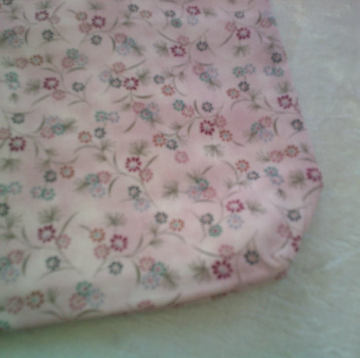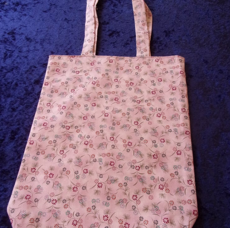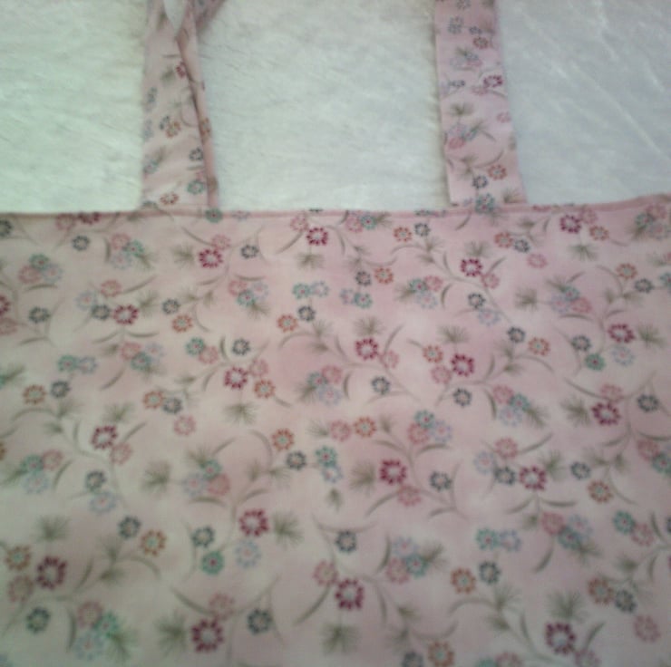 The fabric used is small dark pink and lavender flowers on a pale pink background. It is also fully lined and machine washable.