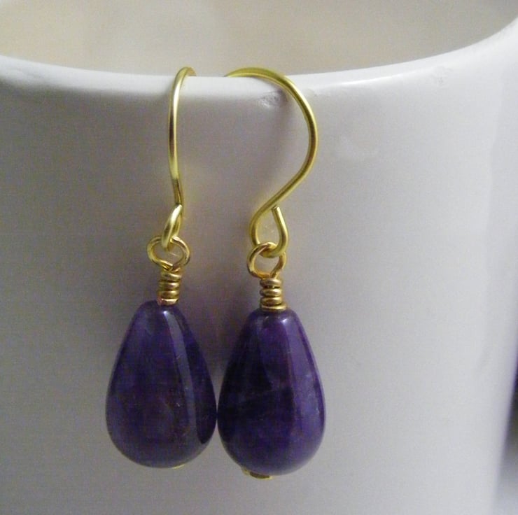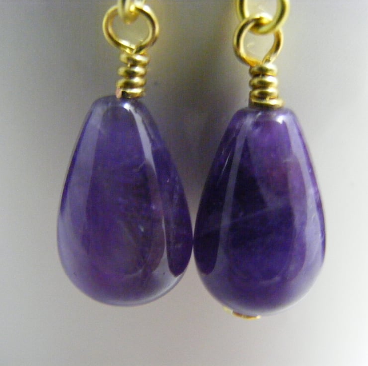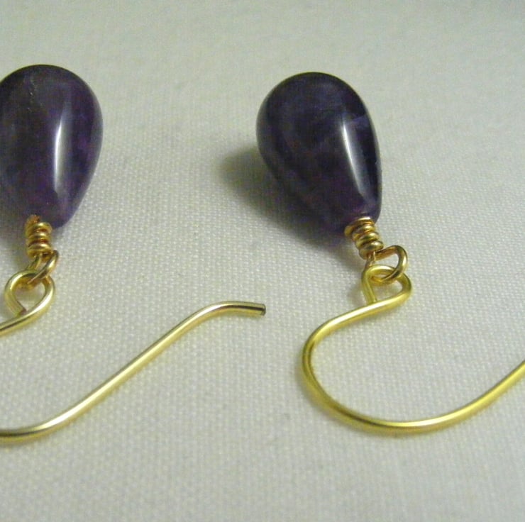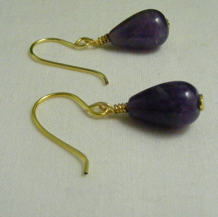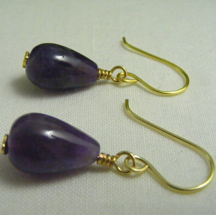 Amethyst earrings are handmade with, 15 x 10 mm amethyst gemstone drops, gold plated headpins and ear wires which I've made with gold plated wire. Wire is hypo allergenic and resistant to tarnishing.