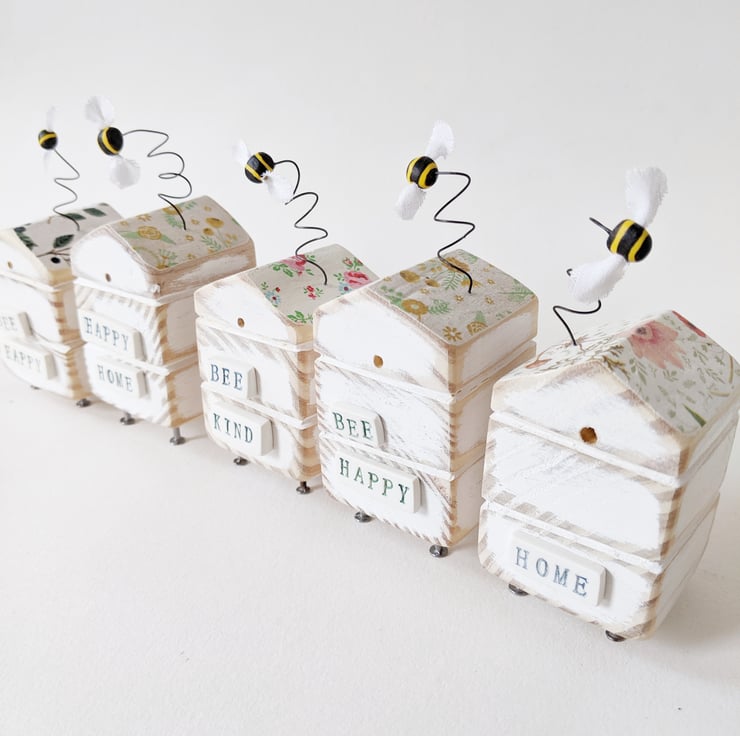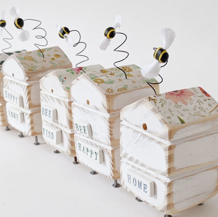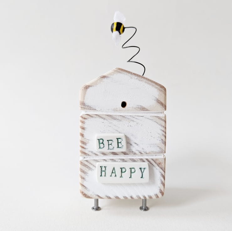Painted white and sanded smooth the roof of the hive is adorned with flowers and the little bee dances on a bendy wire. The sign on the front reads 'Bee Happy' and is made from polymer clay which is shaped, fired and painted, as is the bee with the tiniest fabric wings to finish.