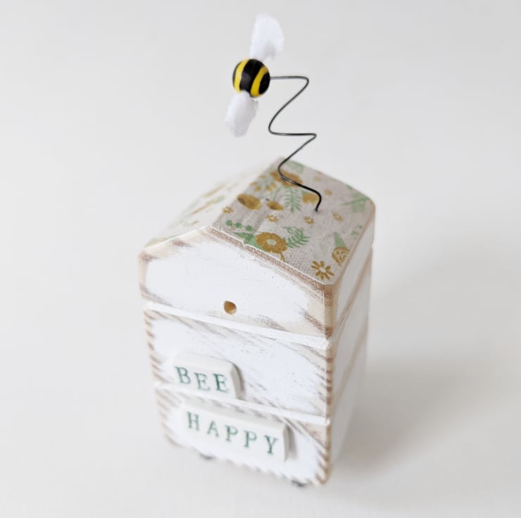 This little beehive is hand carved and painted, with a floral decoupage roof! A tiny stripy bee buzzes above.