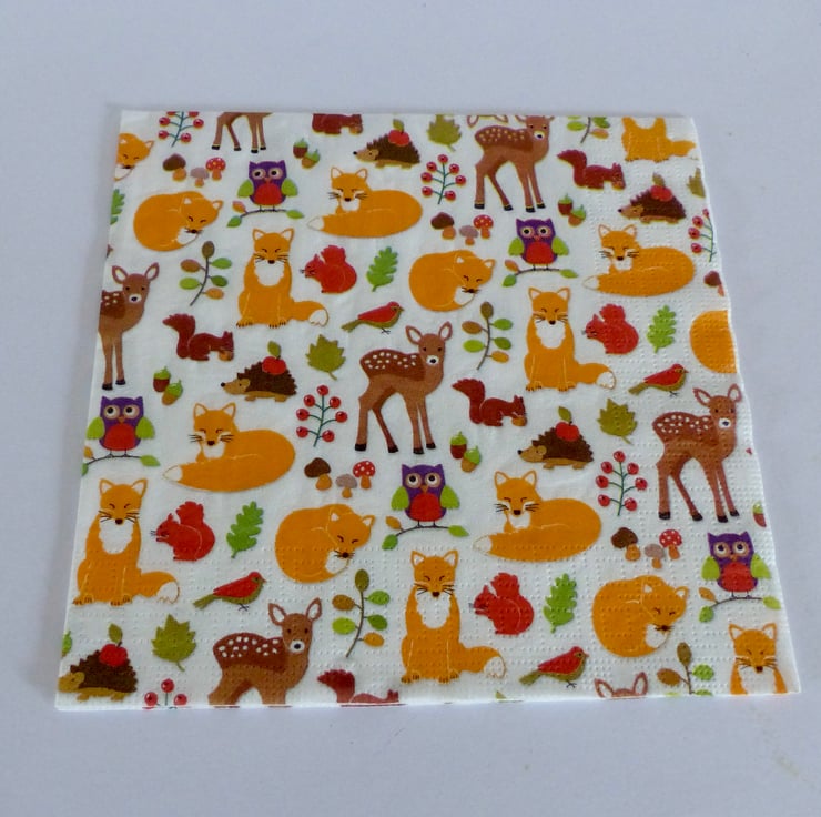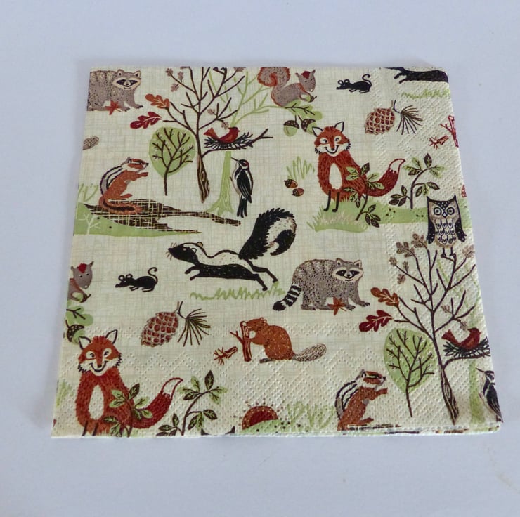 Four x different design 33cm paper napkins. Two different Animal napkins, 1 x Bird & Berries and 1 x Owls. Ideal for decoupage etc. This item will be sent by Royal Mail packed to arrive safely.