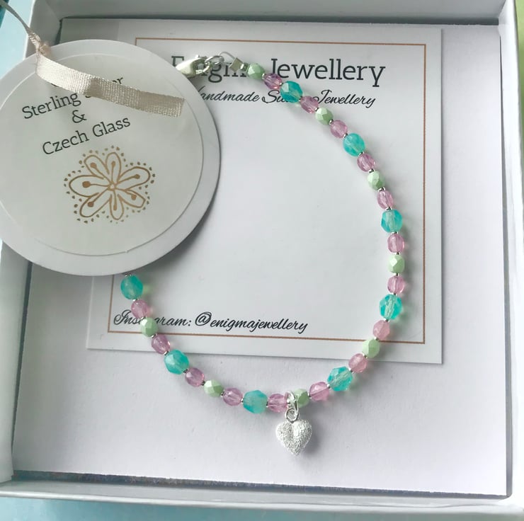 This is such a pretty beaded bracelet using pastel Czech glass beads & gorgeous sterling silver ‘stardust’ puffed heart charm! Would be just perfect for a Summer outfit or wedding