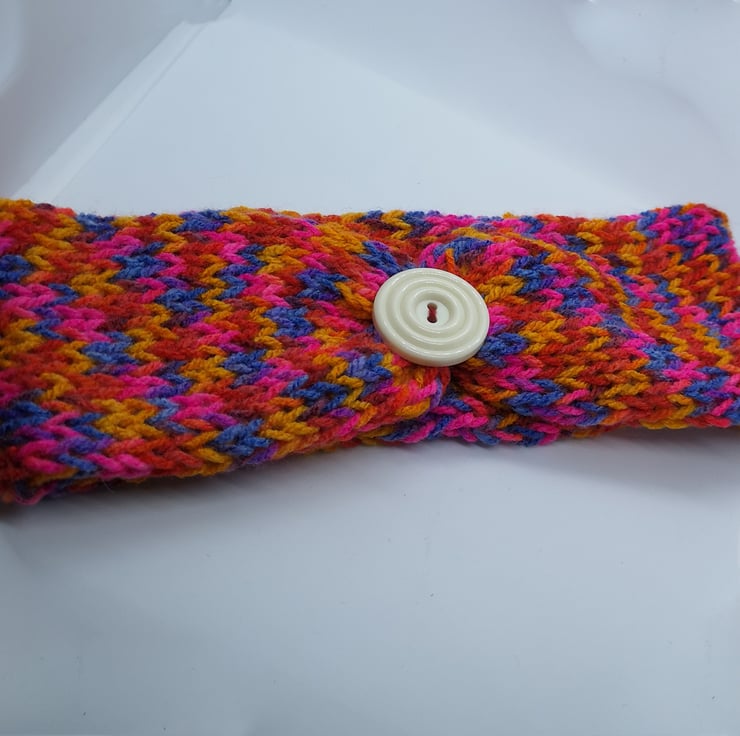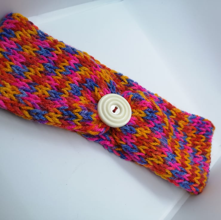 A handknitted hat in a 100% acrylic rainbow blend yarn with darker flecks with button detailing.