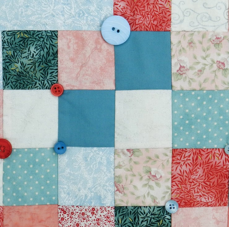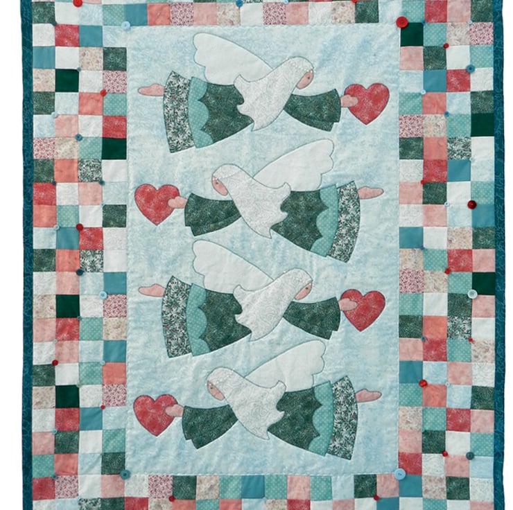 I’ve embellished the border with buttons in toning colours, and little pearl beads create the angels’ haloes. The whole quilt is bound in dark green.