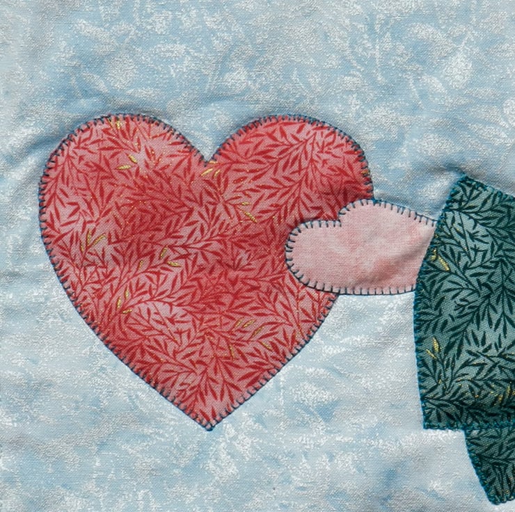I’ve chosen a slightly softer version of the traditional green-and-red Christmas colour-scheme, picking cotton fabrics in tones of soft grey-green and peachy red, complemented with touches of silver. The chequerboard border is machine pieced; the angels are created using fabric fusing, edged and quilted with machine blanket stitch in dark green.