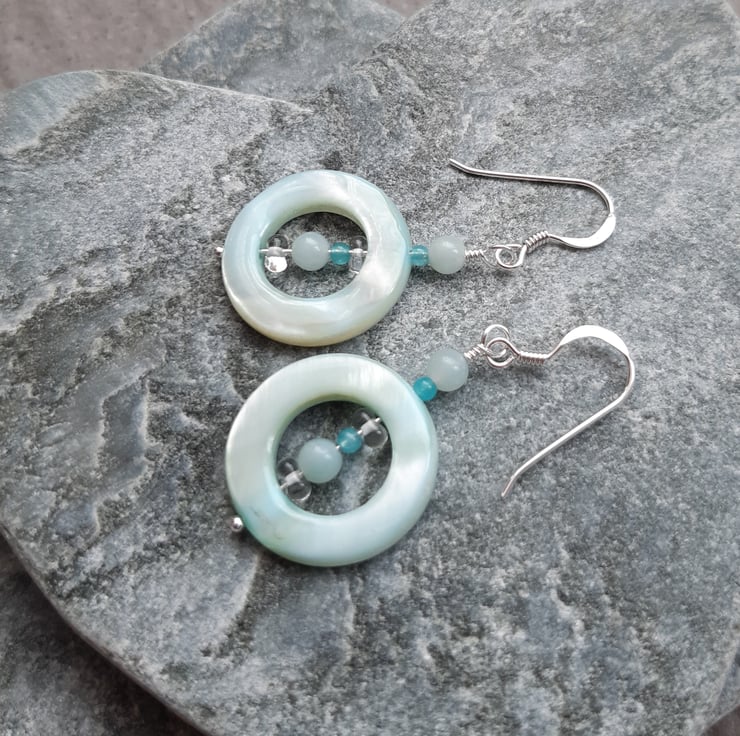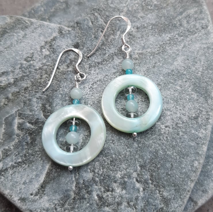 Hoop shaped mother of pearl in a pale aqua colour, amazonite semi precious gemstones, small white/clear glass beads and small quartzite beads are attached to sterling silver ear wires