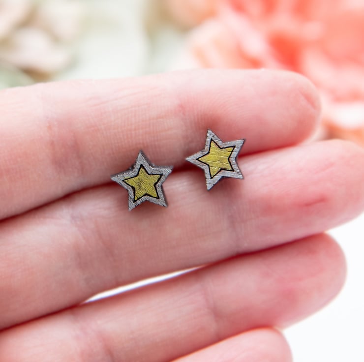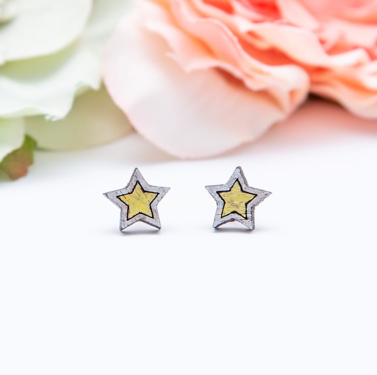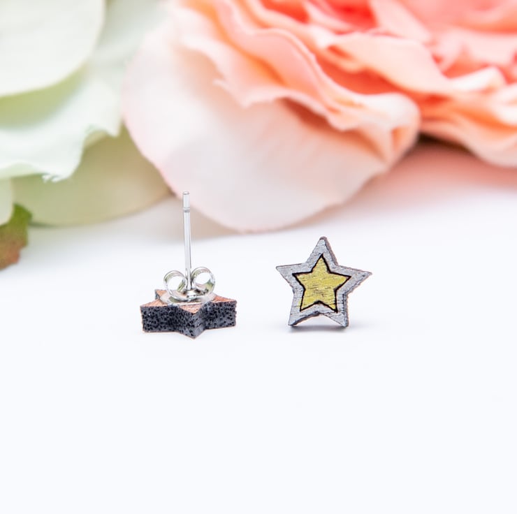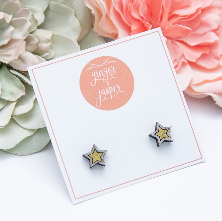 Featuring a laser cut wooden star, these fun and quirky earrings are hand-painted in silver and gold and finished with a matt varnish to protect them. As these earrings are made to order, they can be painted in different colours if required. Please just leave a note when ordering if you would like to request a colour change.
