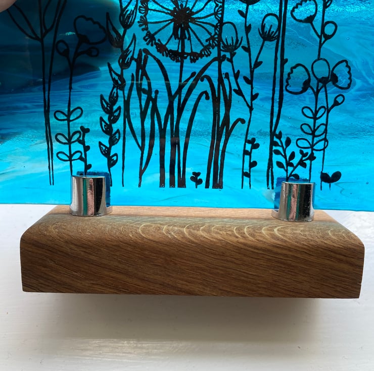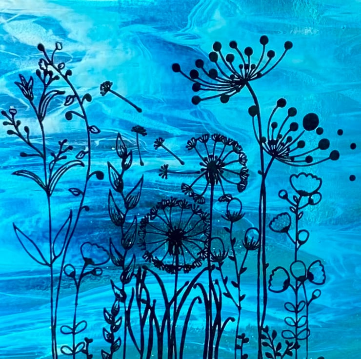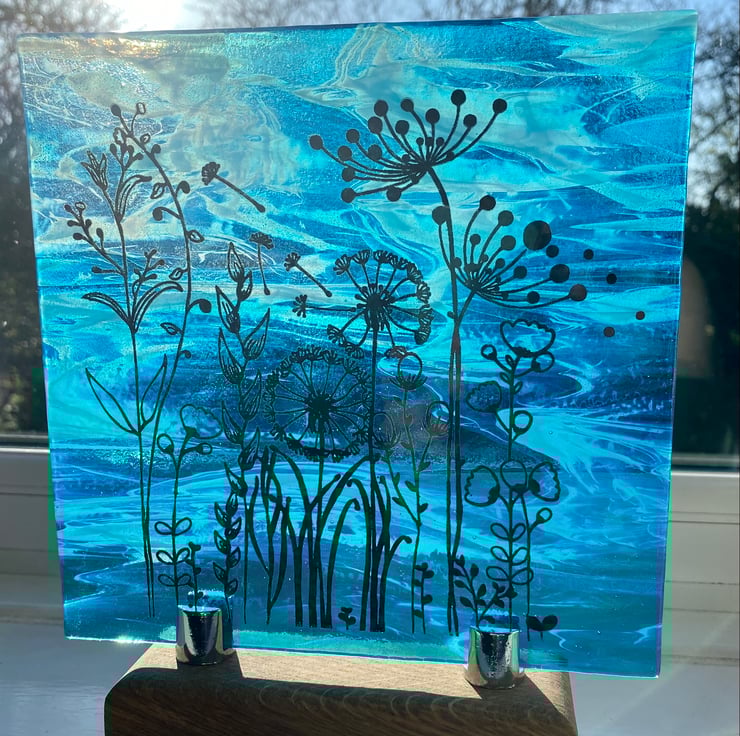 The glass used for this panel is a beautiful mix of cloudy turquoise, clear and white. A floral meadow image with lots of lovely detail has been screen printed on to the glass in black enamel before fusing in the kiln.