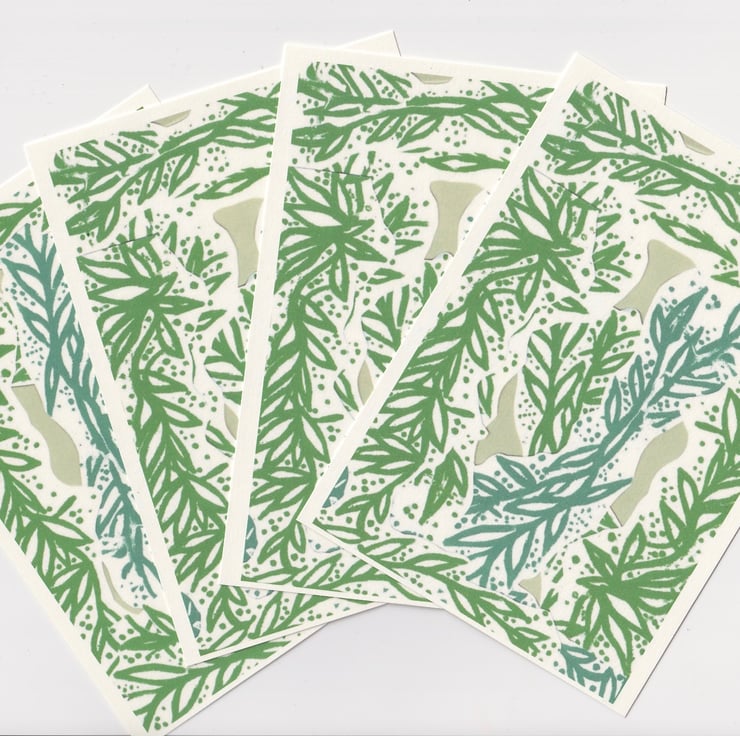Set of 4 green leaf print postcards.
