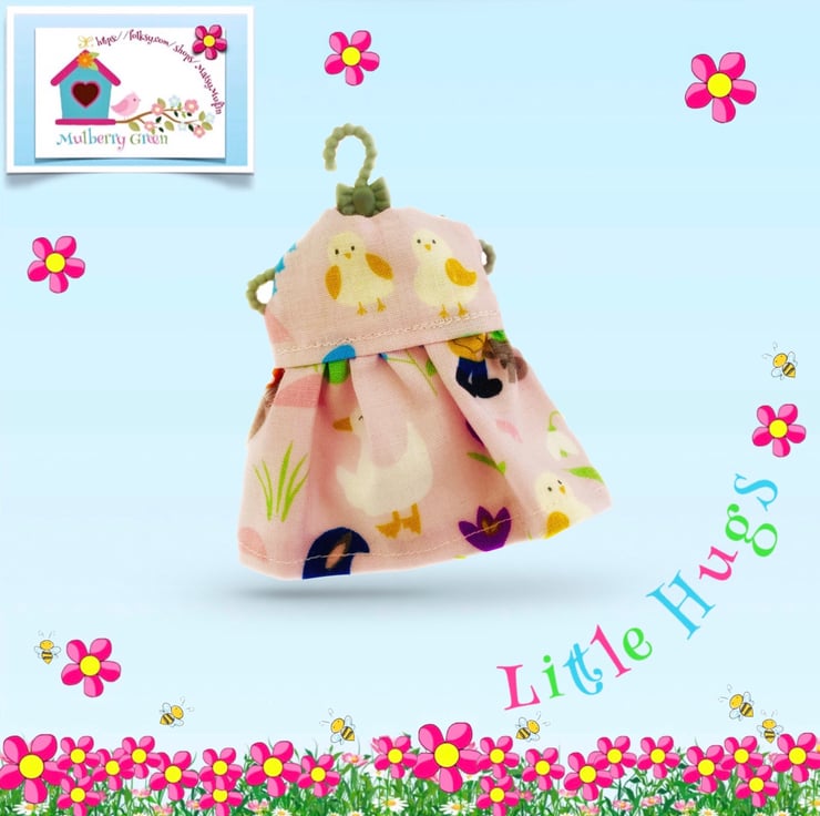 A cute little cotton dress in a baby birds print made especially to fit the Little Hugs dolls or baby Daisy. The dress is made from best quality cotton and has a lined bodice and gathered skirt. It fastens at the back with a little popper and comes on a cute little hanger.