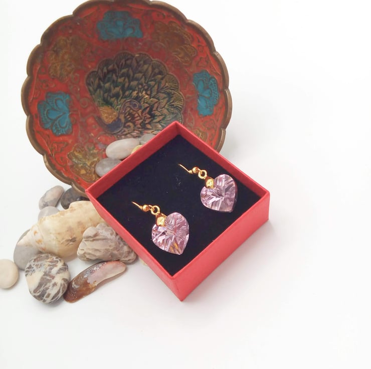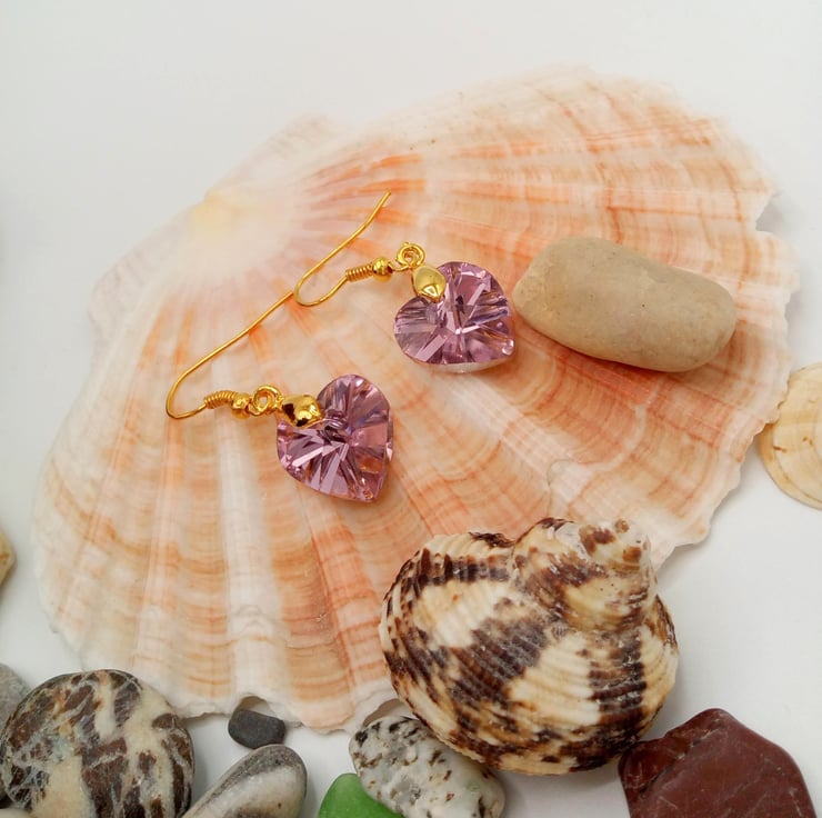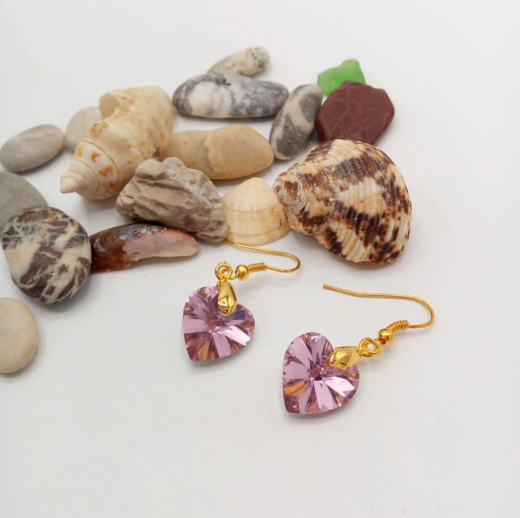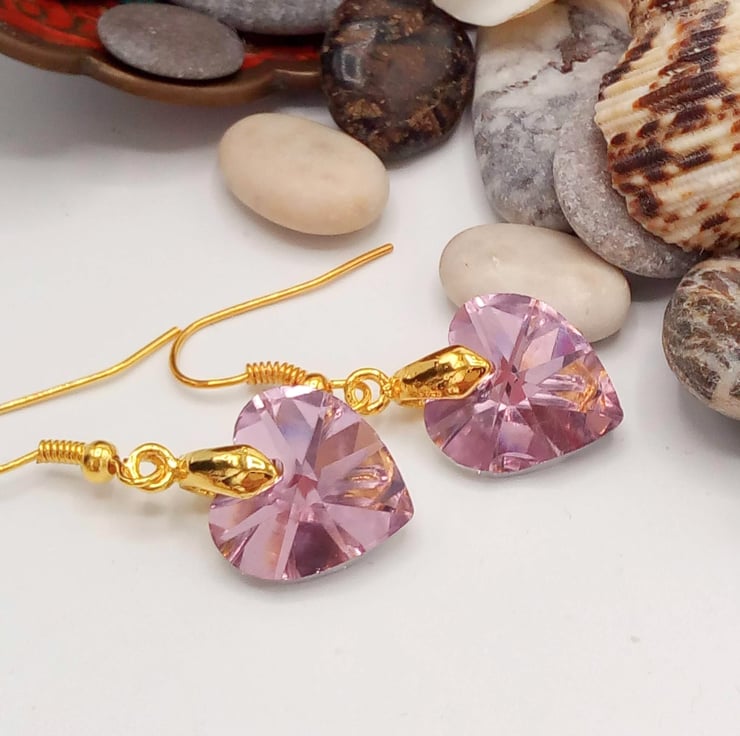The 25mm x 20mm heart shaped sparkly pink crystal hearts are suspended gold plated fish hook ear wires. The earrings have a 1 inch (2.5cm) drop.
