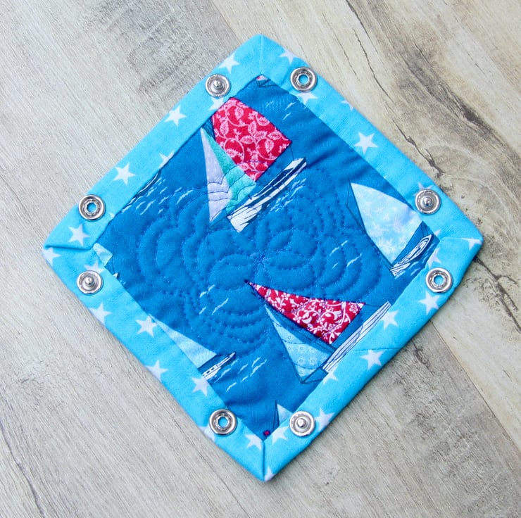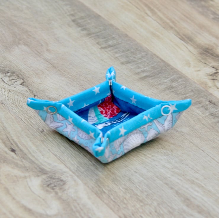 They are made using a mixture of seashells on dark blue fabric and sailboats on pale blue fabric, then quilted with an eco-friendly wadding (made from recycled plastic bottles) to give the box some shape. The edges are bound using a light blue fabric with stars. Finally, close to the corners are four metal snap fasteners holding the box closed so you can store the box flat when not in use.