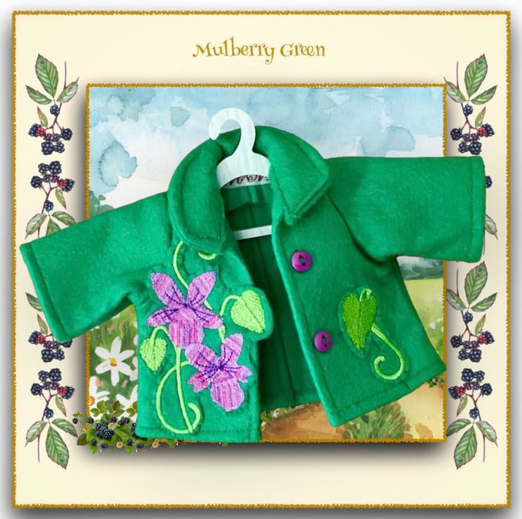 A beautiful tailored jacket to fit the Mulberry Green dolls. The jacket is in deep turquoise green and is embroidered with magenta flowers. The leaves slightly overhang the front edge of the jacket to give a lovely botanical effect. It is finished two little buttons.
