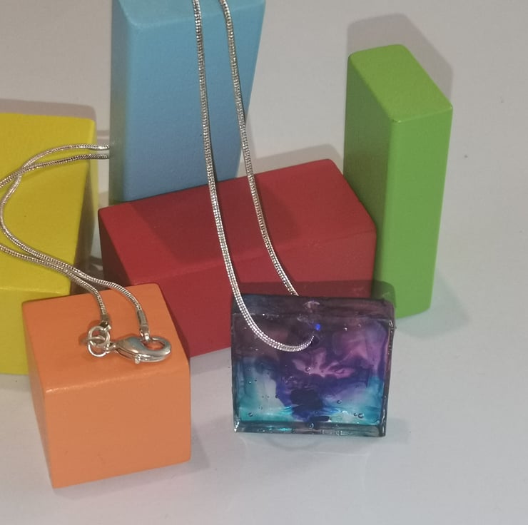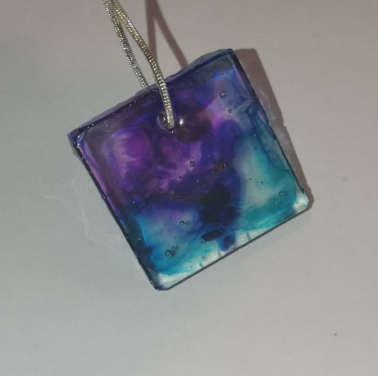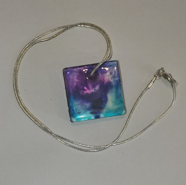 Have a peek into the galaxy with this resin pendant,made up of purple and blue ink swirled into clear resin, this square pendent will truly take you to space with a sliver on the snake chain finished off with a lobster clasp