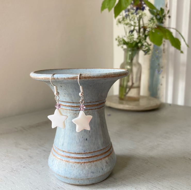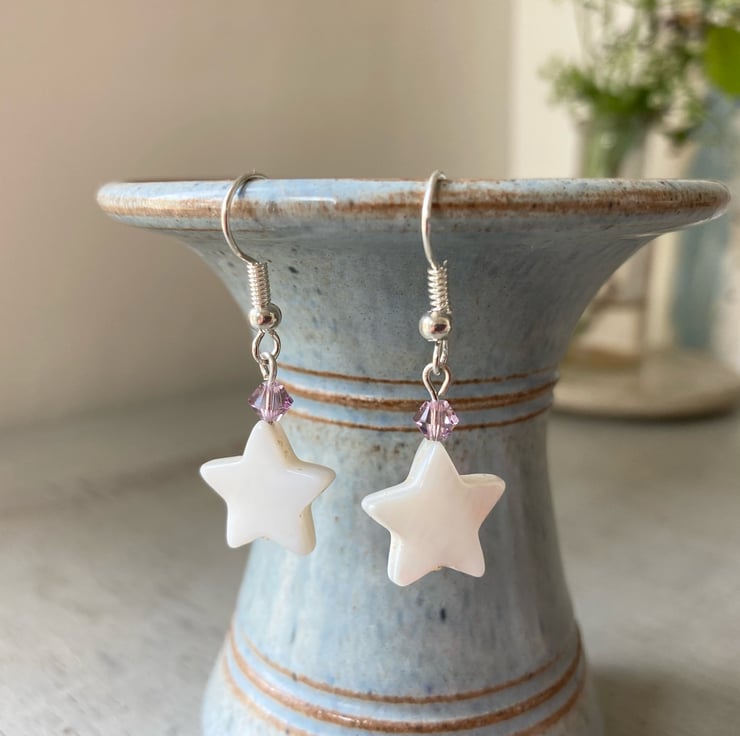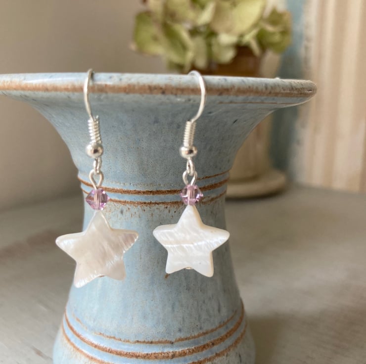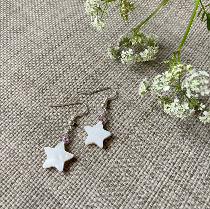 Pretty earrings made with beautiful shell stars, dusky pink Swarovski crystals and silver-plated earring hooks. The earrings are approximately 3.5cm in length including the hook. Available in other crystal colours - please ask if you would like a colour not listed.