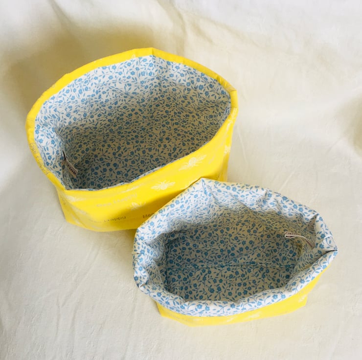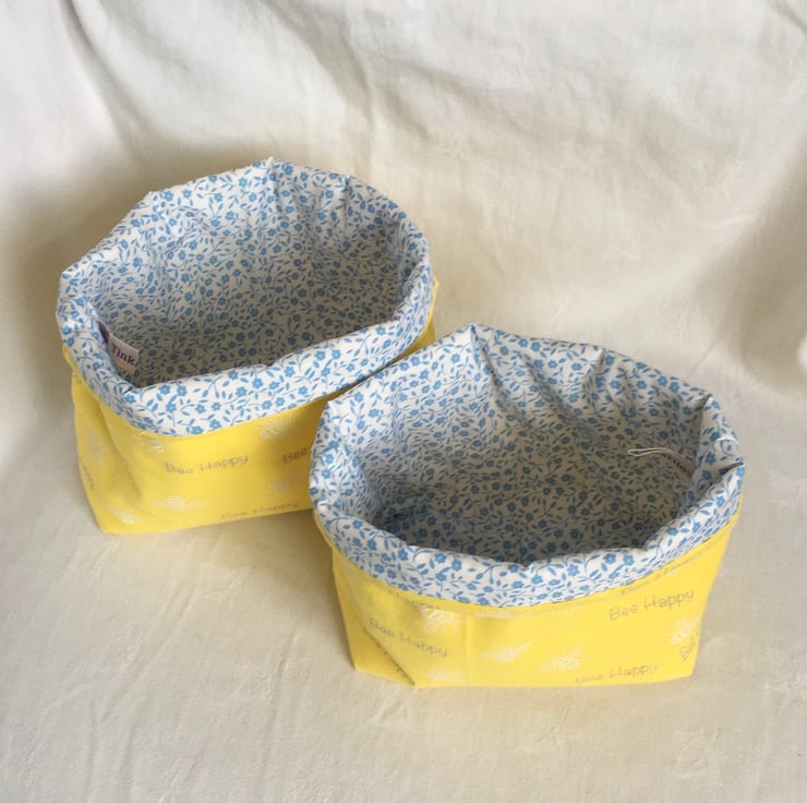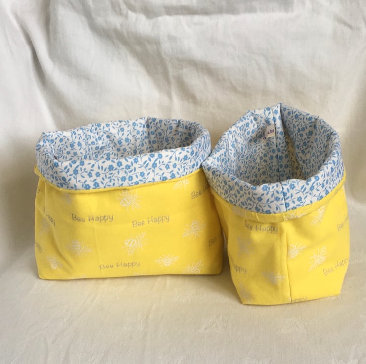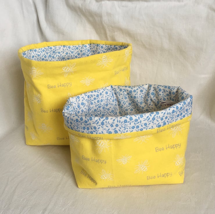 The boxes have been made with high quality cotton fabric for the outer and lining and thick batting used for stabilizing the structure. The outer is in Bees and 'Bee Happy' wording print on yellow background and lined with a small print blue floral on white background cotton fabric. Each box can be left upright or the tops can be folded down to give contrast and to height desired.