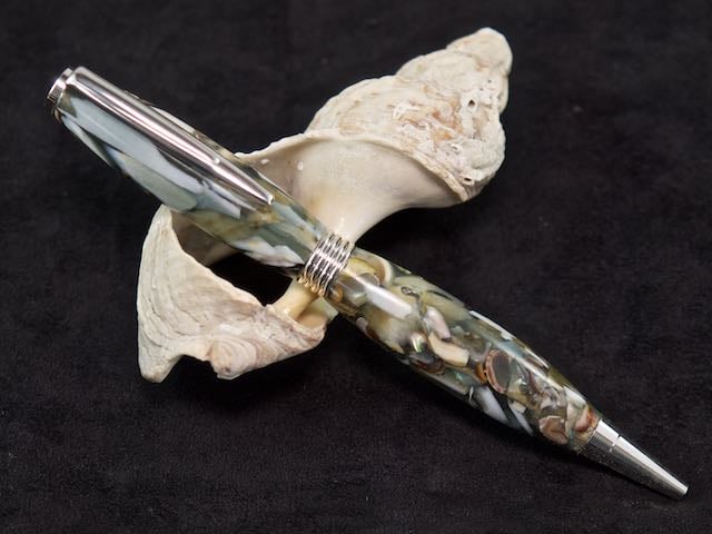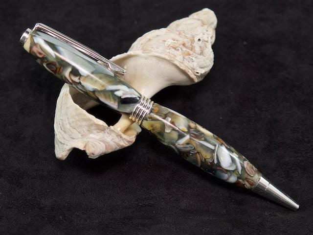 This rollerball pen is made with real Orkney sea shells. The spectacular two piece twist-pen has crushed periwinkle, limpet and razor-clam seashells collected from the Sands of Wright, South Ronaldsay. Periwinkles have a huge range of colours, and those used in this pen have bright orange, browns, yellows, greens and the sparkling mother-of-pearl sea-glitter. Little pieces of true Orkney jewels, the pen and its' shells will bring you back to our serene islands every time you look at it. The colour-cast in the resin binder is a dark misty green, similar to the colour of our rock-pools at night, and the shells seem to float within the pen giving it a spectacular 3D effect, the vibrant colours of the periwinkles contrasting with the grey-white of the razor-clams. This pen takes Cross refills, which are available in all stationers shops and online. Remember that every time you write with this pen, you will be holding a peedie piece of Orkney. The pen is 135mm long, about 14mm diameter and weighs 36g.