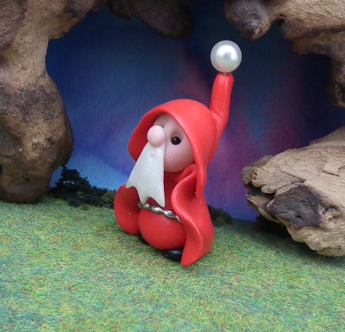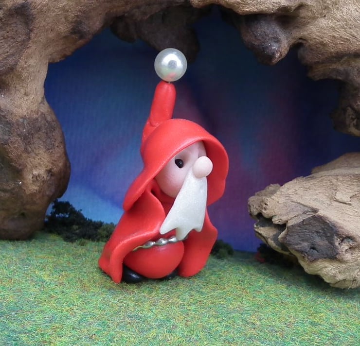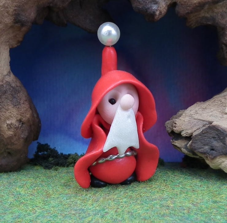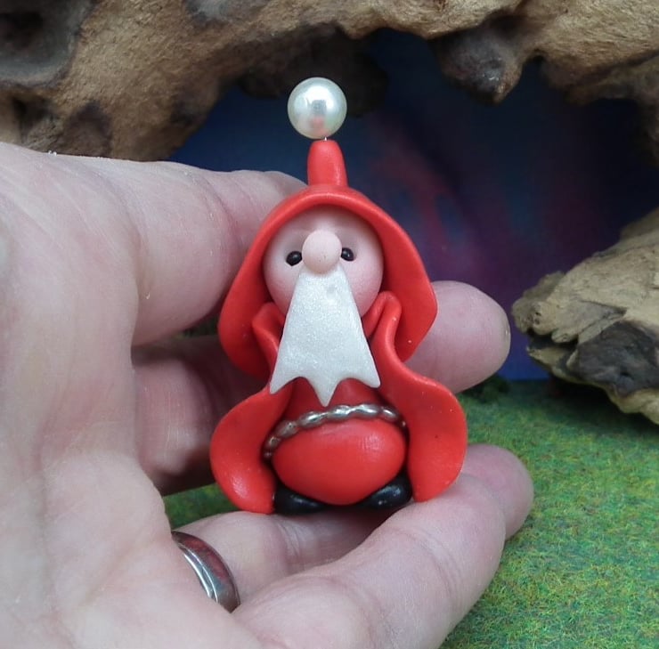 This is a 'one of a kind' creation having been entirely handmade without the use of moulds here at my studio on the Sussex Coast. Modelled with Prosculpt polymers, painted with heat set paints before sealing with lacquer, Nicholas Gnome has sparkling black onyx eyes and a snowy beard. Nicholas is just one and a half inches tall.