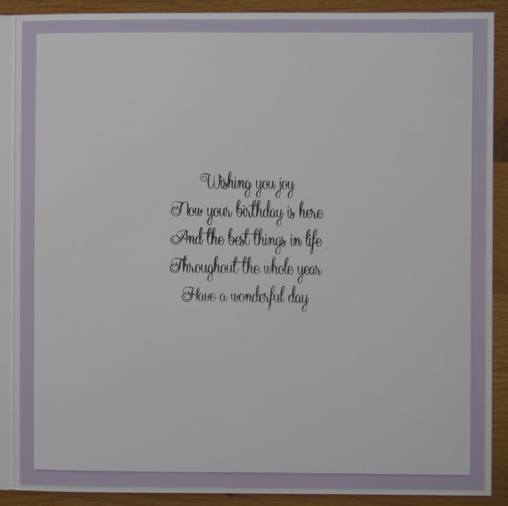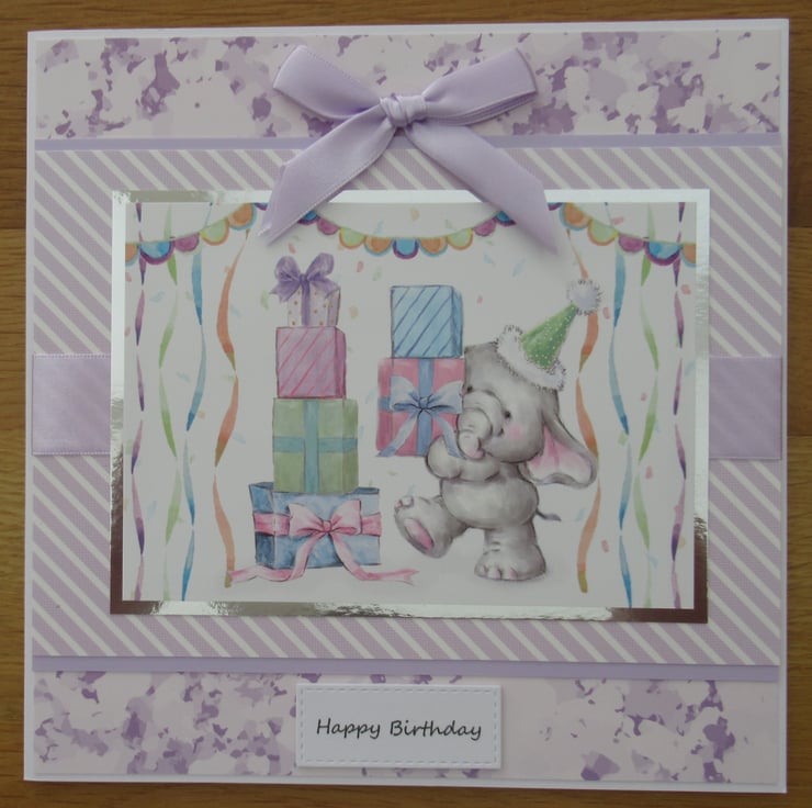 This pretty card in pale lilacs features a cute image of an elephant surrounded by presents and party streamers. A silver mat and two different patterned cardstocks are layered behind the image, as well as a satin ribbon border across the card and a bow as an extra embellishment. There is a Happy Birthday greeting below the image and the inside of the card is finished to coordinate with a stamped birthday verse as pictured.