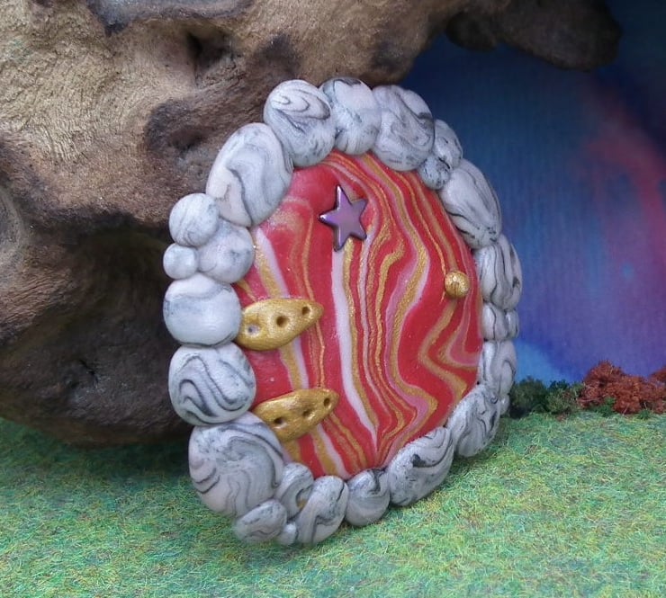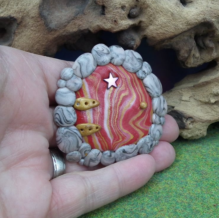 This is a 'one of a kind' creation having been entirely handmade without the use of moulds here at my studio on the Sussex Coast. Modelled with Prosculpt polymers, painted with heat set paints before sealing with lacquer, The door is two inches high and can be attached to any flat surface with the fixing pads on reverse. A smaller door for Gnomes who don't mind stooping to enter ...