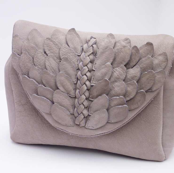 The braid in the centre has been braided into the front flap itself. The leaves were each individually crafted, edge dyed and sewn onto the front flap. The creation of this piece took a long time and was a true labour of love!