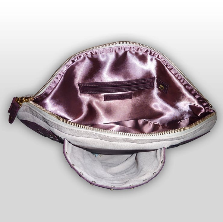 Oversized clutch made with soft lilac-grey buffalo nubuck and vibrant purple detailing. The lining is a silky soft, yet hard-wearing designer polyester fabric.