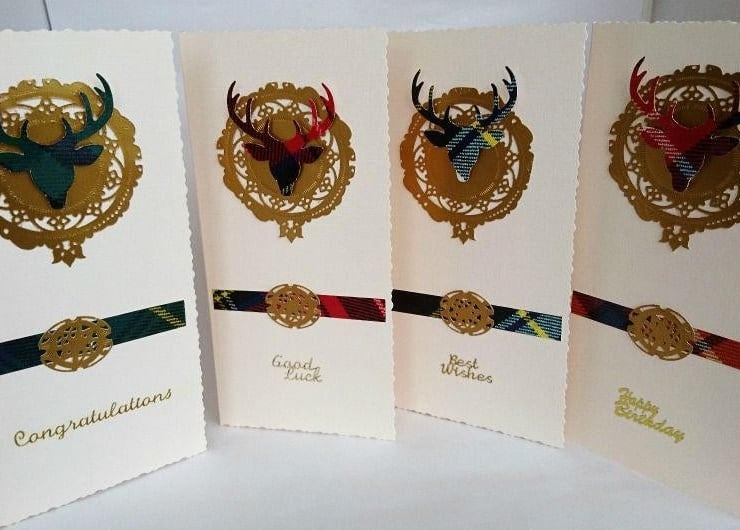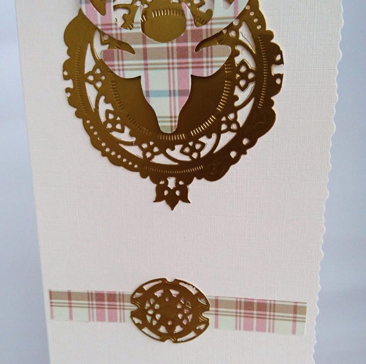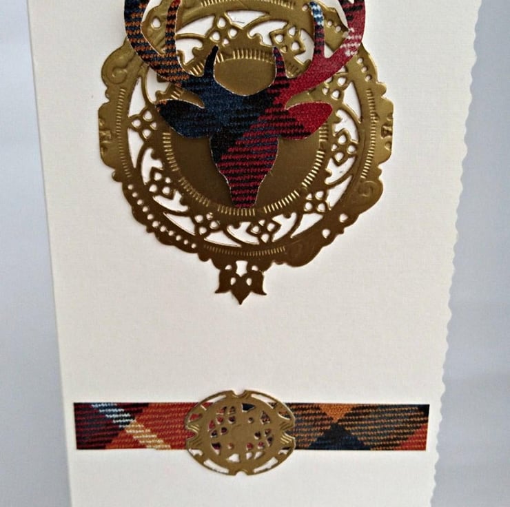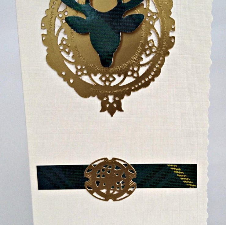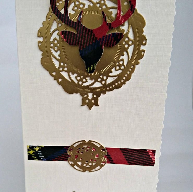 Details: Top Quality deckle-edged cream DL Portrait Card, decorated with strip of tartan to represent the kilt and gold decorative oval for buckle. Matching tartan stag head on gold clan shield/crest shape with a choice of gold sentiment i.e. Happy Birthday, Thank You, Congratulations, Best Wishes, Good Luck, Invitation etc. Handmade in my wee studio in Argyll, Scotland.