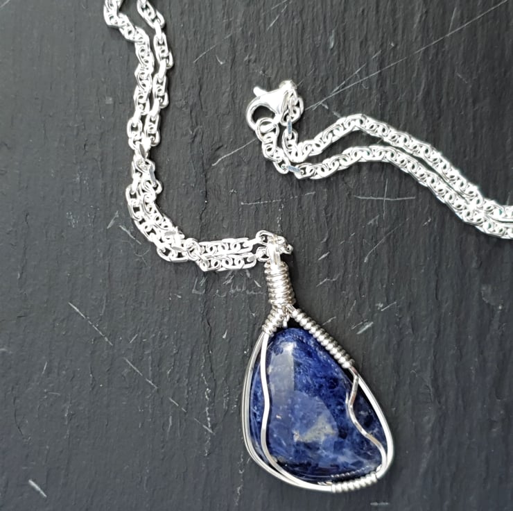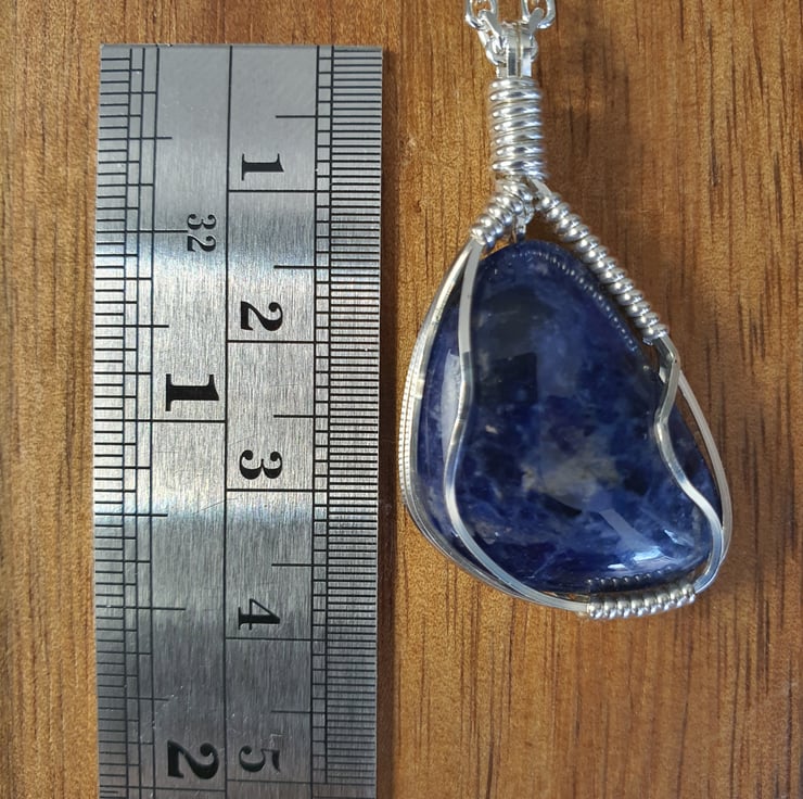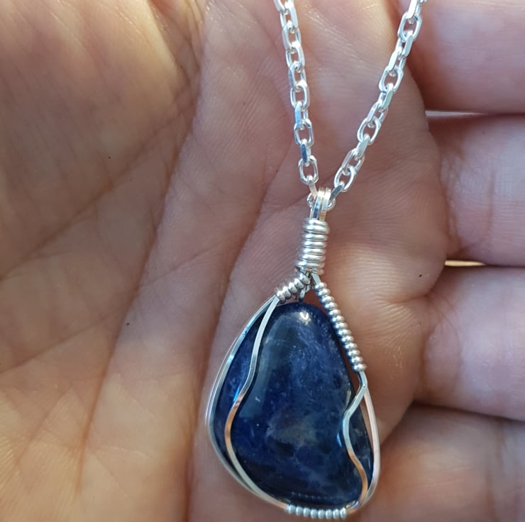 Beautiful deep blue Sodalite crystal wire wrapped with square sterling silver wire.