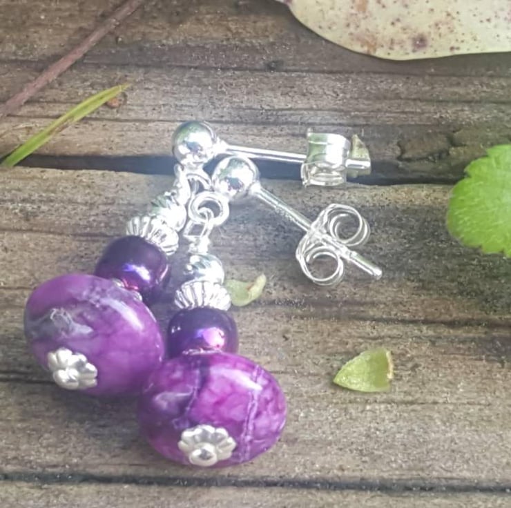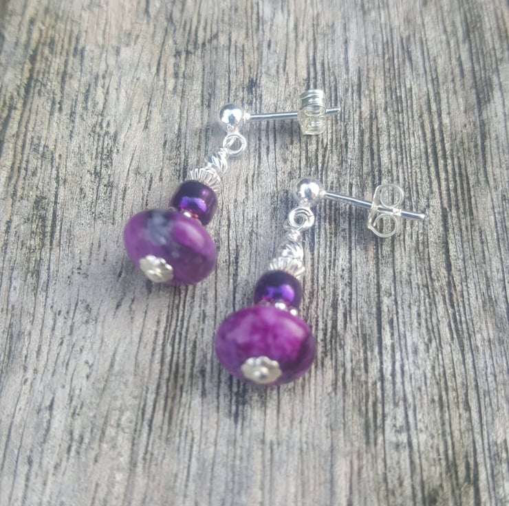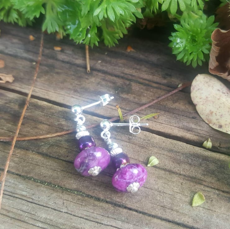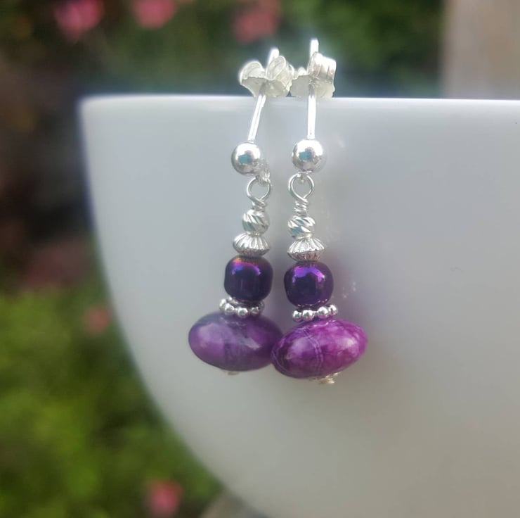 These pretty purple drop earrings are made with gorgeous dyed jasper rondelles and topped with sterling silver and purple dyed hematite beads.