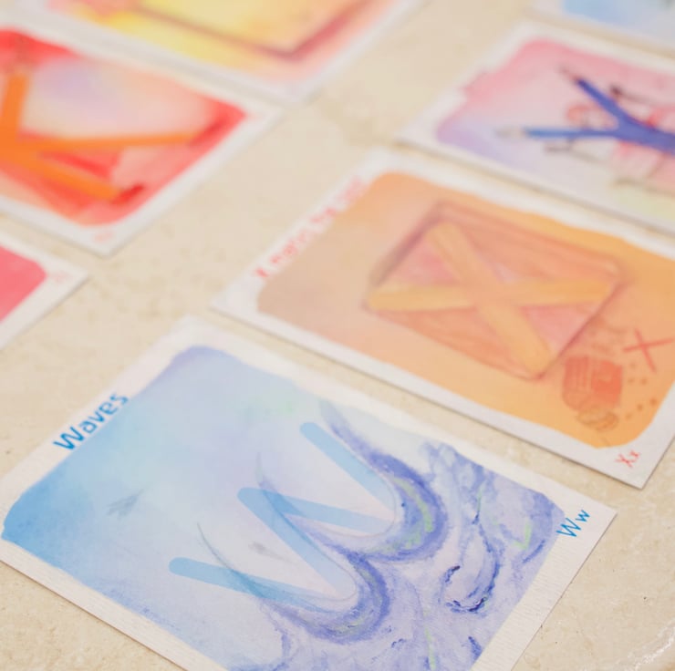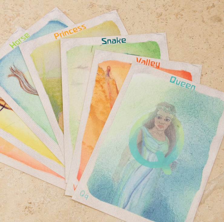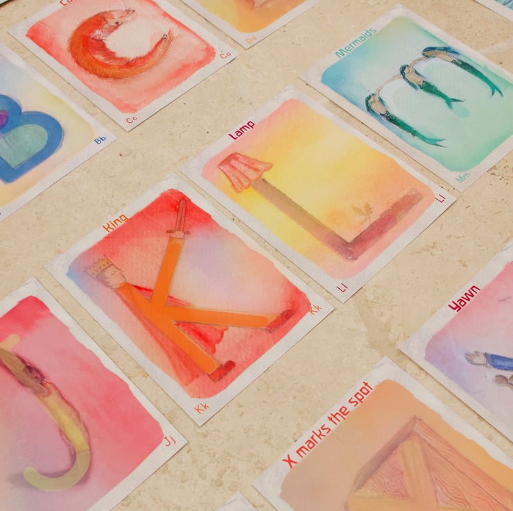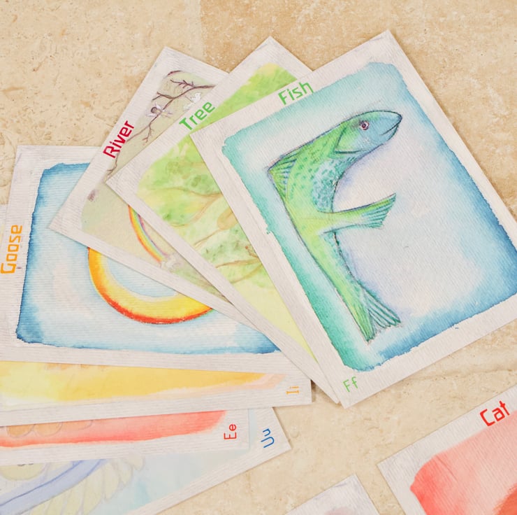 The difference between this and other ABC cards is that the Vowels are all represented as an Angel. This created an oppertunity to discuss what the singing letters (the vowels) do to the sound of letters. Each Angel card is a different colour and they are refered carries the sounds of the consonants out into the world: they give our language feeling. The consonant letters are focused on a physical thing, C for Cats and F for Fish V is for Valley, ideal for story telling or discussing sounds.