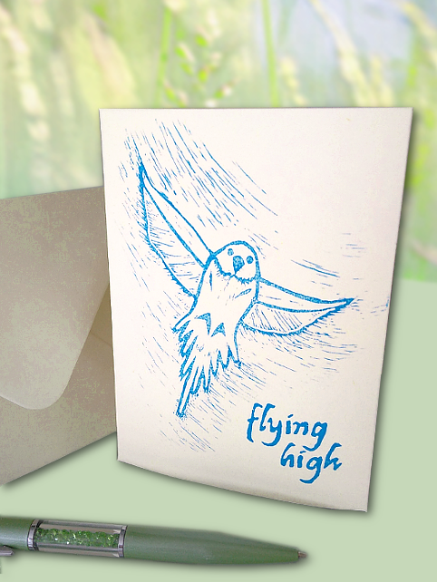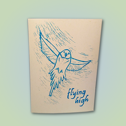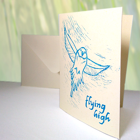 This card has a handprinted design of a flying bird. The words ‘flying high’ are stamped at the bottom. The card is left blank inside for your own message.