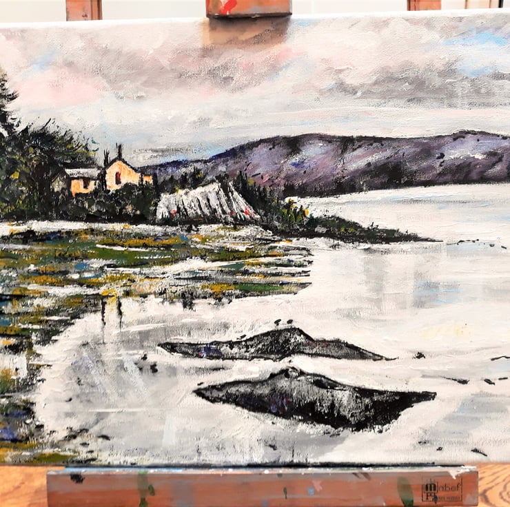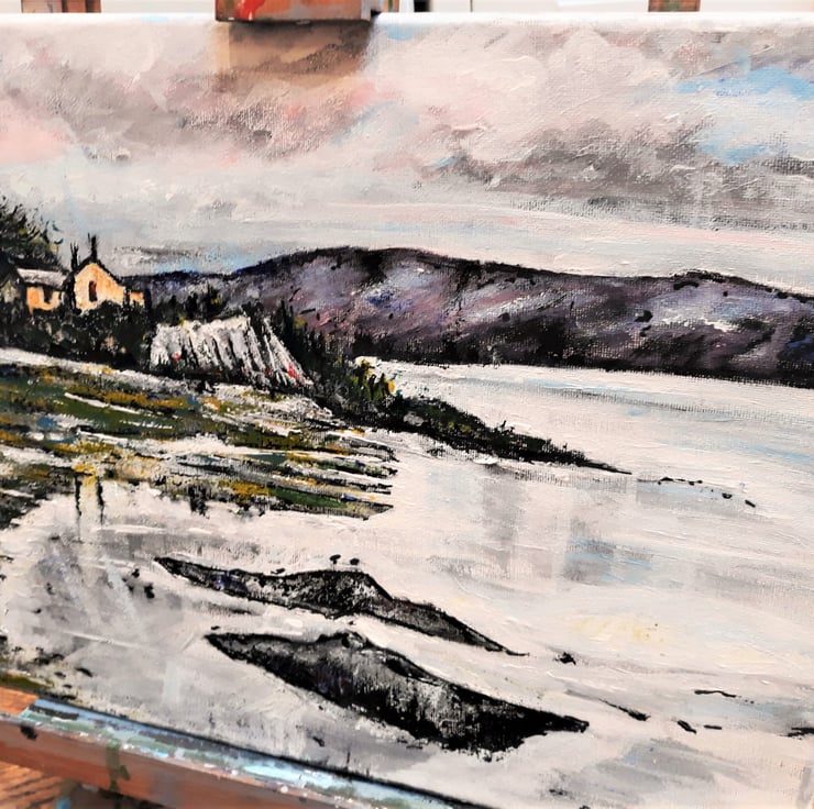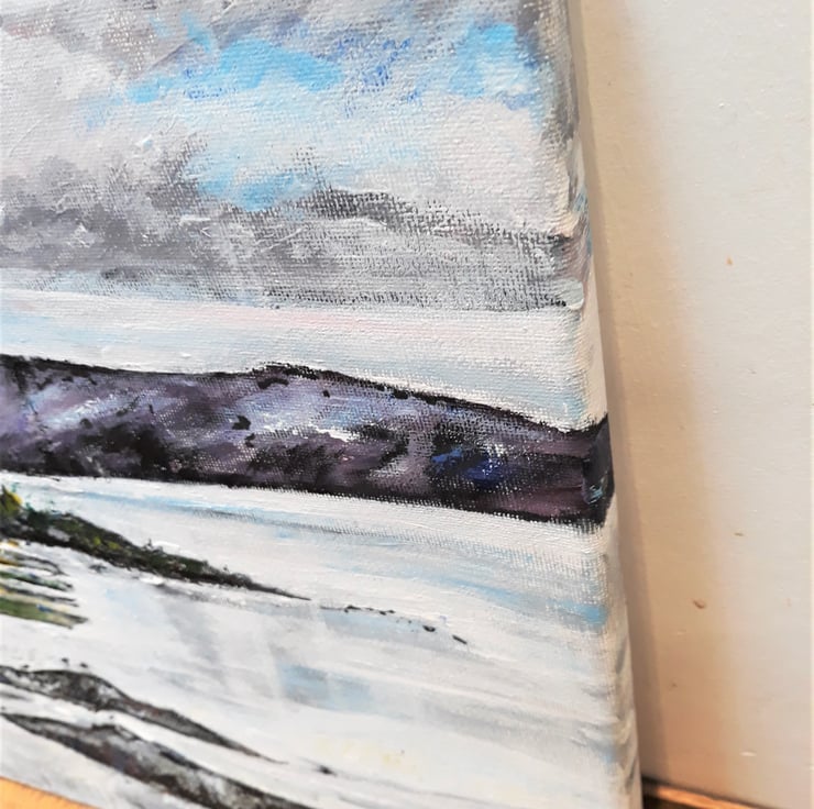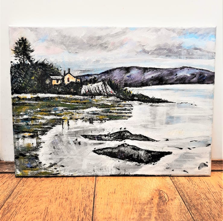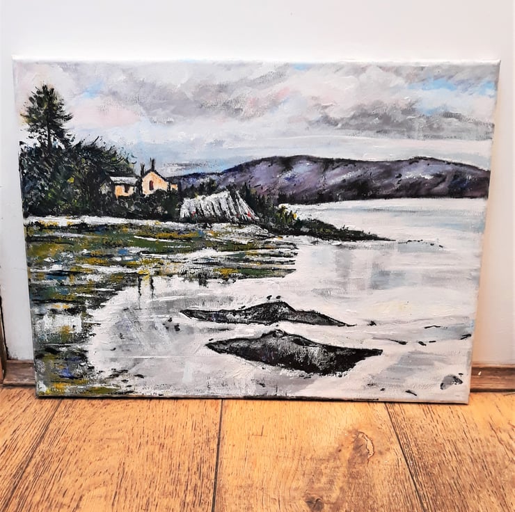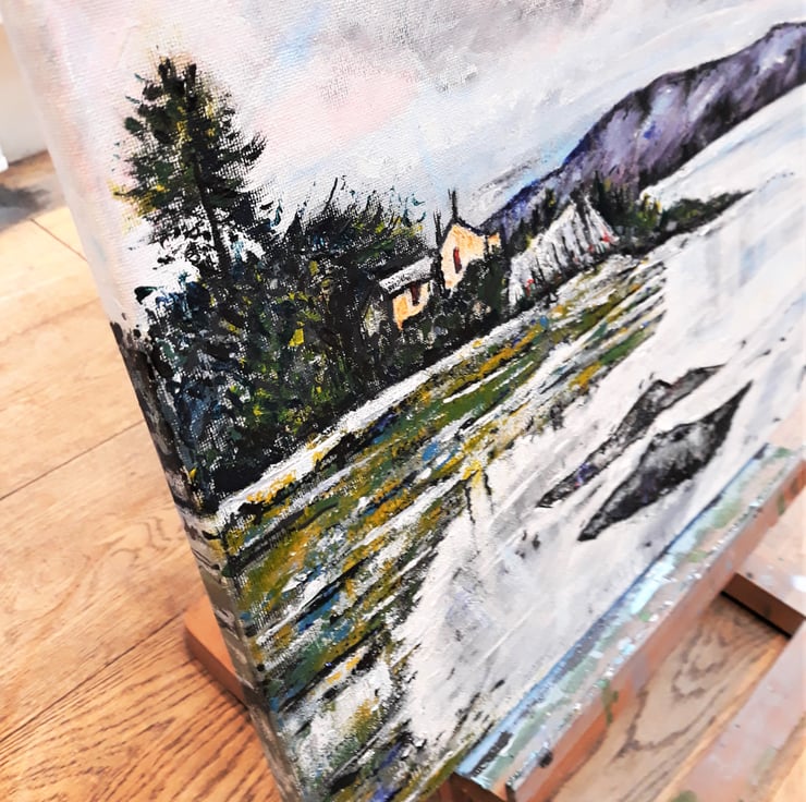 'House in the Wild' is an original painting on stretched canvas. It depicts a lone cottage sitting in a wild Welsh landscape. Painted in acrylics mainly using shades of grey, green, yellow, black, blue and white, with just a hint of pink. There is an expanse of water with hills beyond and a lonely house with trees.The painting is not framed and does not have any fixings on the back. It can be hung with or without a frame as the sides are painted.