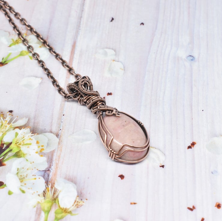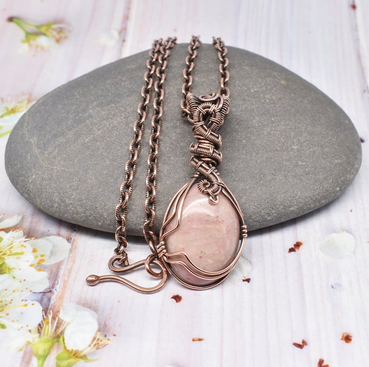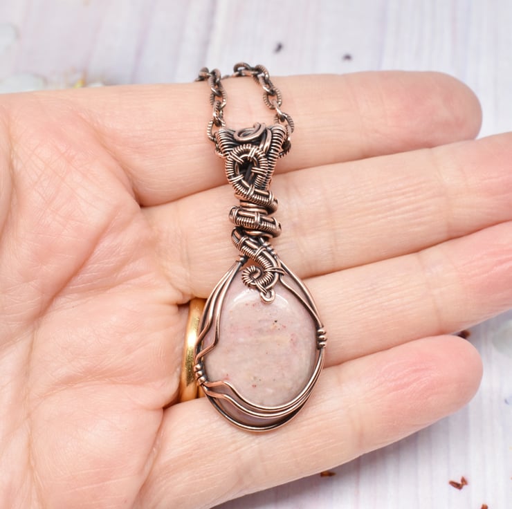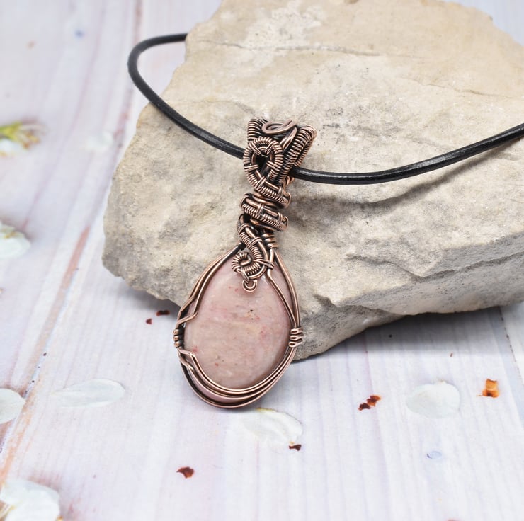 I have wire wrapped and woven this pretty Rhodonite using solid copper wire and added a woven bail to complete the pendant.