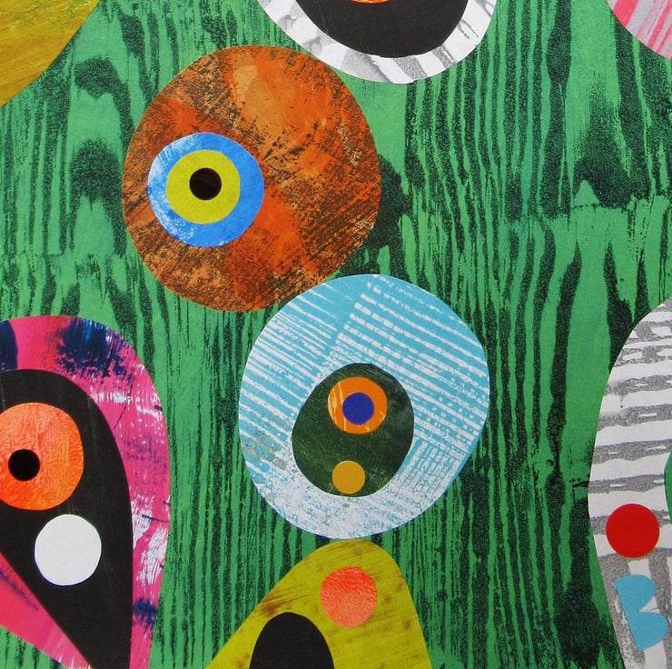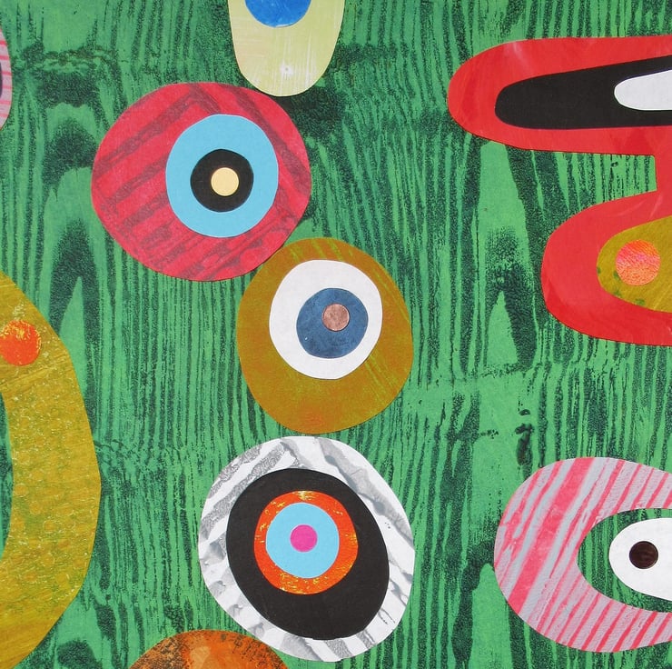 My collage artworks are inspired by the design style of the Eames' Lucienne Day, Rex Ray, Joan Miro etc and the wonderful retro atomic / op art style of the the 50s, 60 and 70s. I create my collages by building up a background colour or texture with layers of acrylic paint, onto which I collage simplified shapes which are made from my own painted, designed papers. This takes the form of numerous, time consuming, small adjustments, additions and replacements to build up to a final balanced composition that is pleasing to the eye.