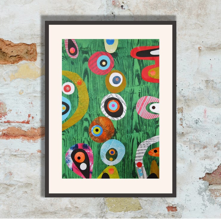 Bold, funky, colourful, mid century modern inspired original artwork in acrylic and collage on light card, measuring 13 x 9 inches, this hand created original is vibrant and uplifting. It is 'signed' on the front with a collaged "B" and hand signed on the back by Bea. The artwork comes to you unframed - framed photos for illustrative purposes only.