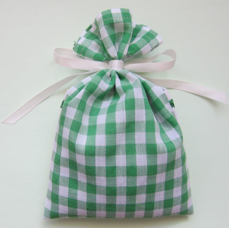 Lavender drawer sachet made from green and white gingham and decorated with a vintage embroidered red and green flower design trim and green ric rac braid.