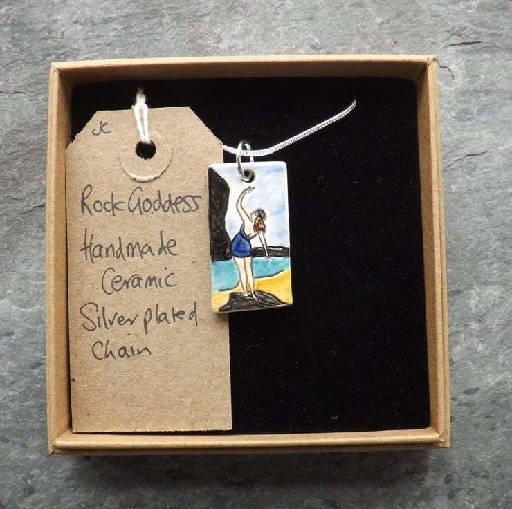 This retro-styled bathing beauty is elegantly posed amongst the rocks, she's wearing a deep blue swimsuit. The sea is a delicious turquoise and the sand golden. As with all my jewellery it is made and decorated entirely by hand.