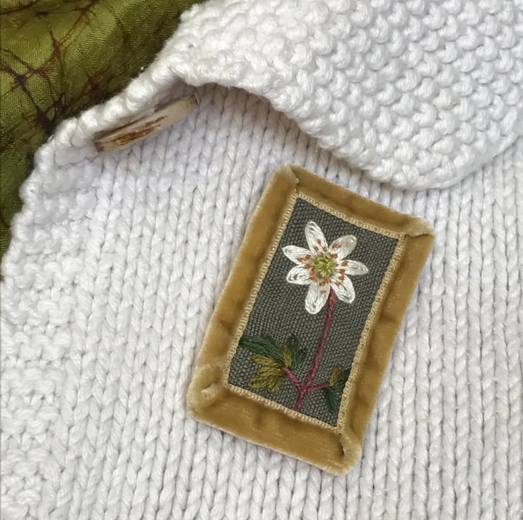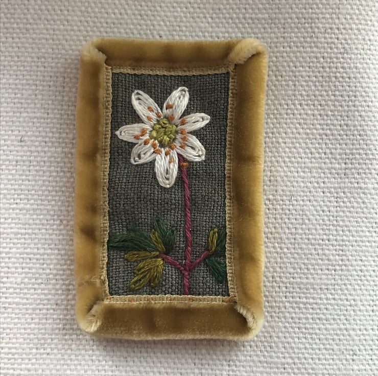 The stitching was carefully sewn onto a piece of soft cotton, there are looped stitched and knots, and stem stitch. It is finished around the edge with soft velvet ribbon which gives the item some structure and a luxurious feel.