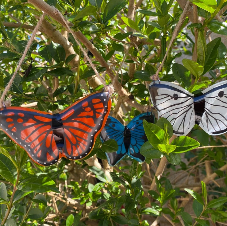 I hand cut each of these butterflies by hand out of a large sheet of glass, I then decorate using glass powder. They are then loaded in to my kiln to fire. These are not mass produced and may each differ slightly. That's what I love about Handmade that nothing is exactly the same. Once they have been fired I clear, tidy up and get ready to post out to you.