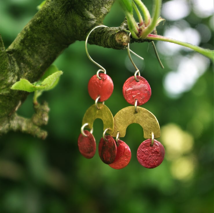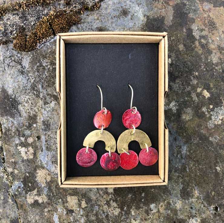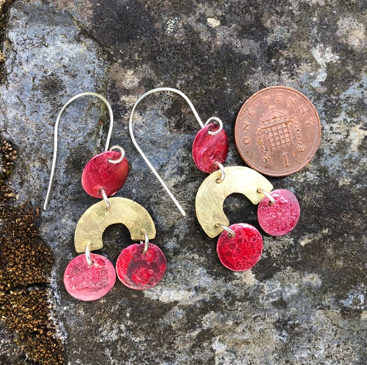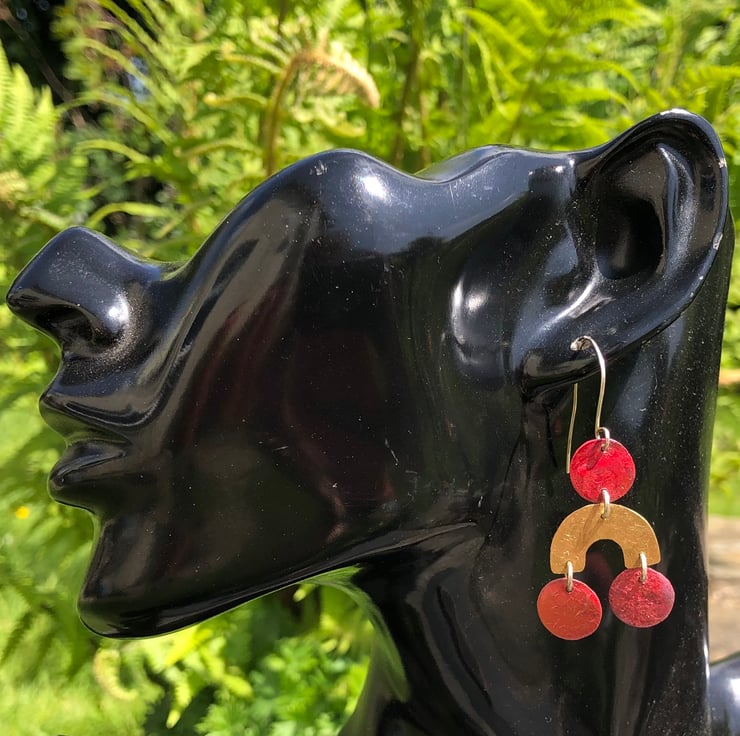 Geometric shapes cut from brass and copper sheet hanging from a sterling silver handmade ear hook. The circle copper shapes have deep red tones and some surface texture as a result of heat; a great contrast with the golden yellow of the brass arc shape, which has a matt/frosted surface.
