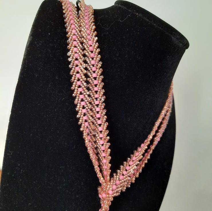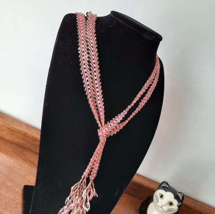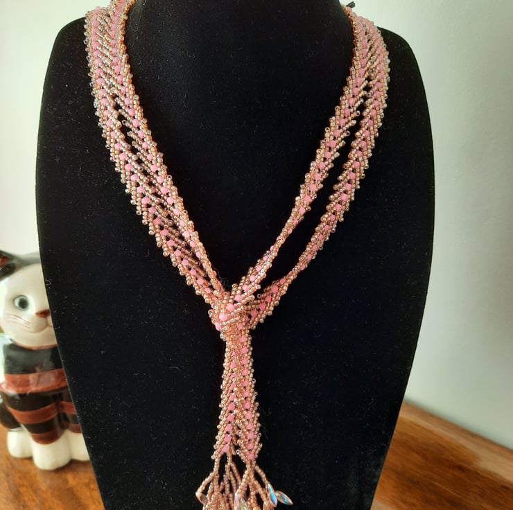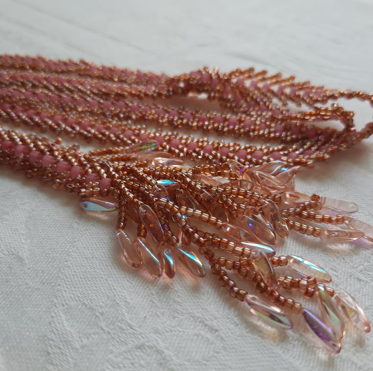 This lariat is beaded using the St Petersburg weave. It is made with Japanese seed beads and Czech glass dagger shaped beads. The seed beads are a combination of transparent brown with a rainbow effect and frosted pink, with the daggers being a pale pink with a rainbow effect too. It doesn't have a catch, so can be worn in a number of different ways such as like in the photo's or wrapped round like a scarf. It is approximately 140cm in length, not including the end tassels. This lariat will come in an organza bag.