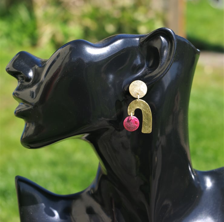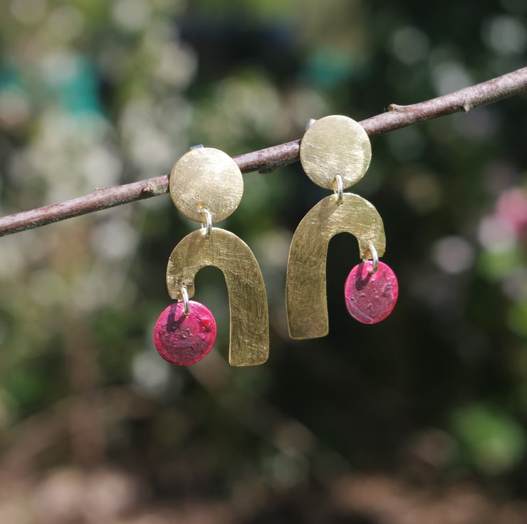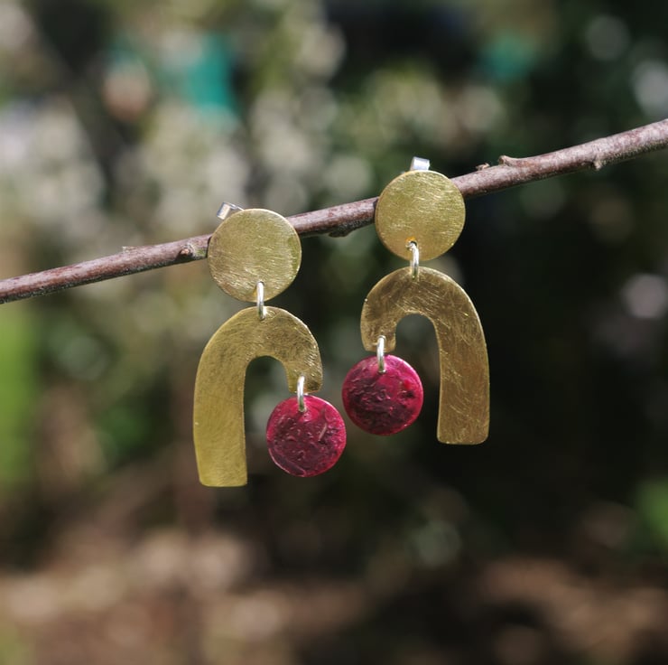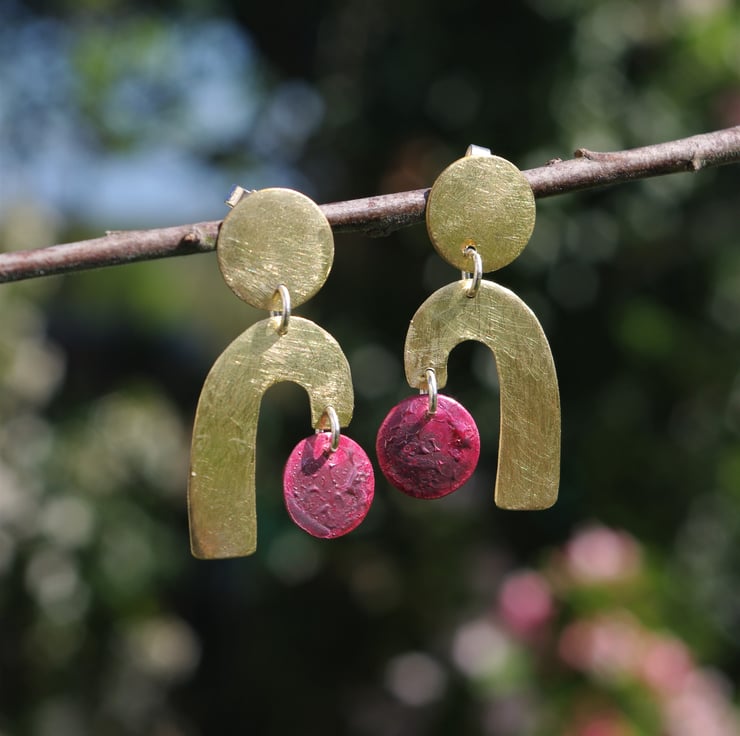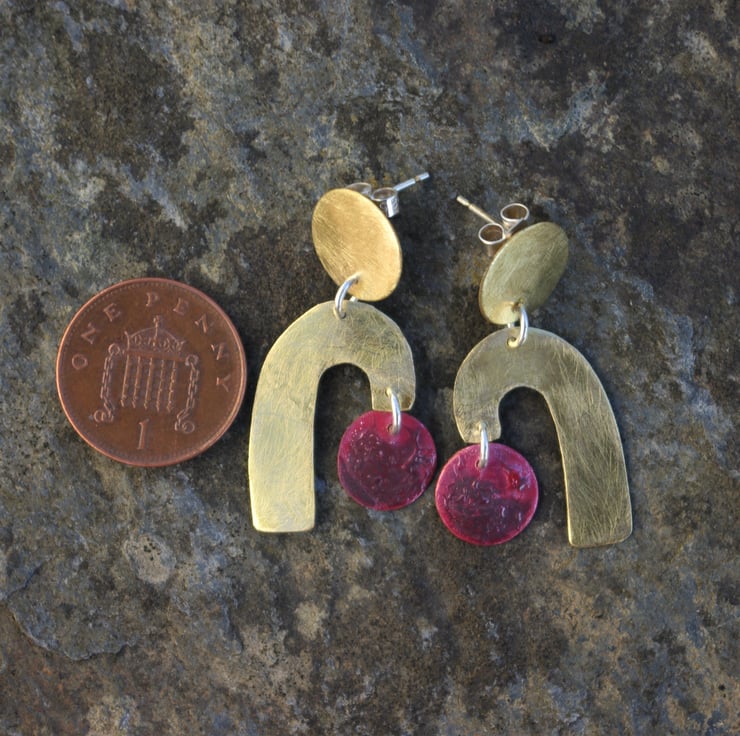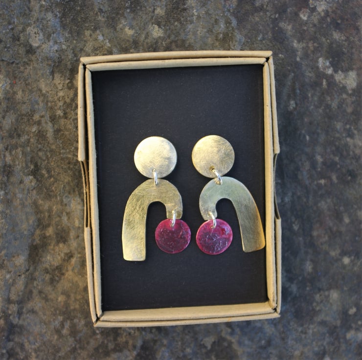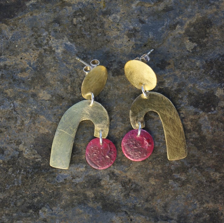 Geometric shapes cut from brass and copper sheet dangle from a circular brass piece which has a stud fastening on the back. The circular copper shapes have acquired deep red tones and some surface texture with the application of heat , which contrasts well with the frosted/ matt surface of the golden yellow brass shapes.