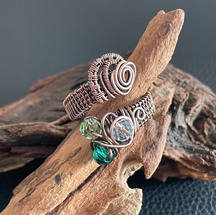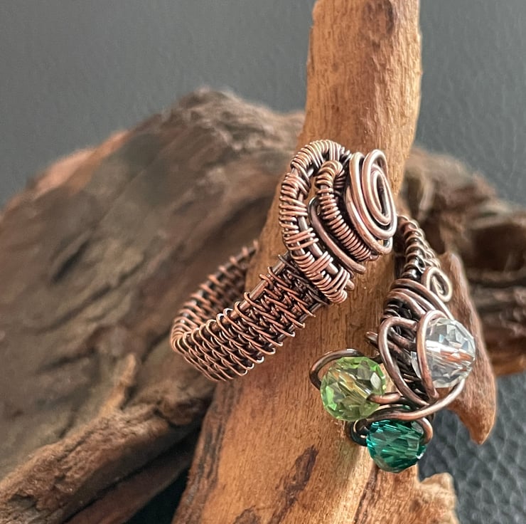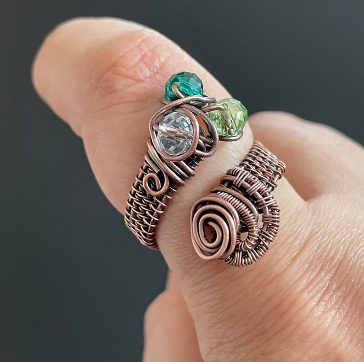 This is an adjustable copper ring that has been antiqued to give it a vintage look. It is made by hand using the wire-wrapping techniques. A trio of glass beads add a unique look and brings a little sparkle. One of a kind.